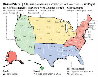 Or so says a Russian professor of something or another, who is also a former KGB analyst. The map portrays his prediction of what will soon happen to the United States of America.
